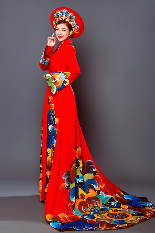 Áo dài biến tấu tà sau dài, rộng với họa tiết vẽ tay chiếm được cảm tình của các cô dâu mê nét Á Đông truyền thống. Mẫu áo gợi sự liên tưởng tới phong cách của Nam Phương hoàng hậu khi được kết hợp với chiếc mấn to bản.