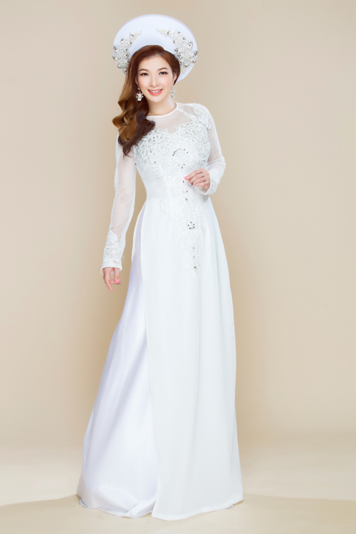 Những cô dâu thích sự tinh khôi, thanh khiết có thể chọn áo dài trắng kết hợp với mấn cùng tông. Thân áo điểm xuyết những bông hoa ren và hạt đá lấp lánh tựa giọt sương mai.