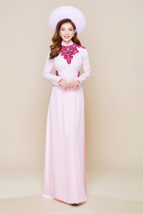 Áo dài lụa phớt hồng được xem là lựa chọn an toàn cho mọi cô dâu.