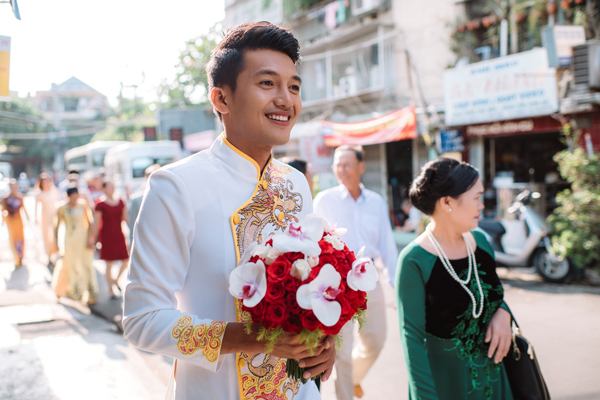 Kỹ thuật in vải nhạt dần và cách bố trí điểm nhấn bằng chi tiết thêu tay, đắp ren mảng lớn ở phần trên tạo hiệu ứng thị giác bắt mắt cho bộ trang phục. Nam diễn viên phối áo dài màu đồng với quần âu, giày tối màu trông sang trọng và tiện di chuyển trong ngày cưới.