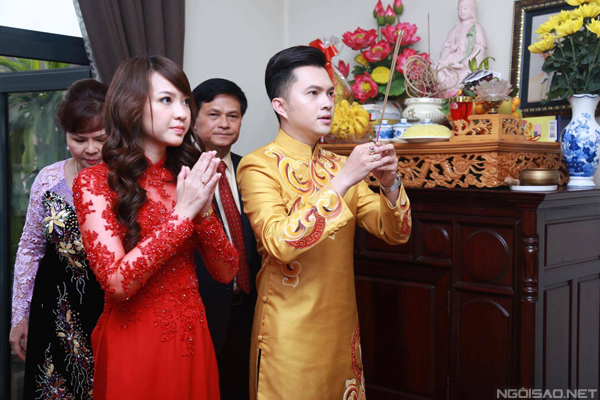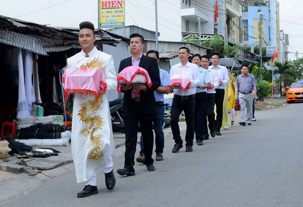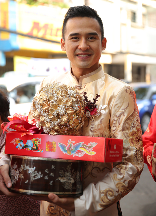 Lương Thế Thành mặc áo dài sắc vàng đồng bưng sính lễ đi hỏi cưới diễn viên Thúy Diễm hôm 12/4. Đây là trang phục được nhà thiết kế Phạm Đặng Anh Thư thực hiện riêng cho nam diễn viên với họa tiết thêu tay và đắp ren tỉ mỉ ăn nhập với màu vải áo và bó hoa kết đính từ kim loại, ngọc trai, đá pha lê.