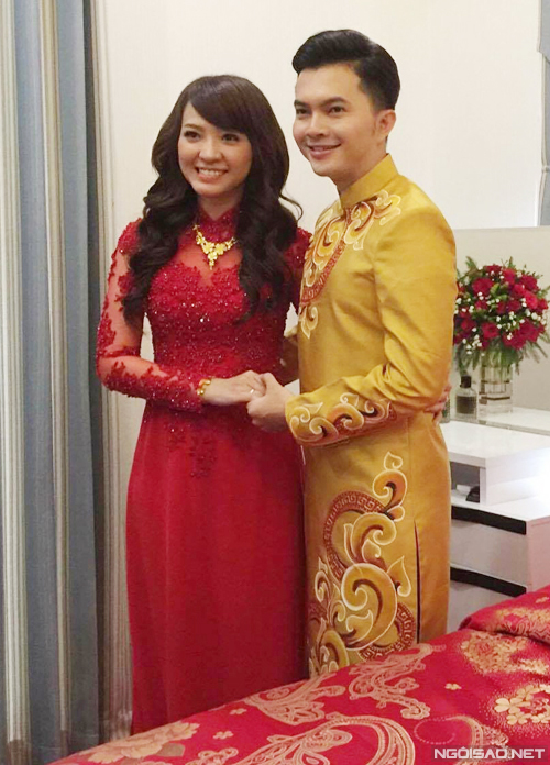 Với lễ rước dâu tại Hà Nội ngày 18/3, ca sĩ Nam Cường chọn áo dài của nhà thiết kế Minh Châu trị giá 6 triệu đồng. Kiểu dáng cách tân trên nền chất liệu gấm tạo nên nét sang trọng nhưng không kém phần trẻ trung cho chú rể. Sự bố trí các hoa văn màu đỏ và nâu trên cổ áo, tà áo và tay áo mang đến cảm giác nhẹ nhàng, uyển chuyển cho bộ trang phục.