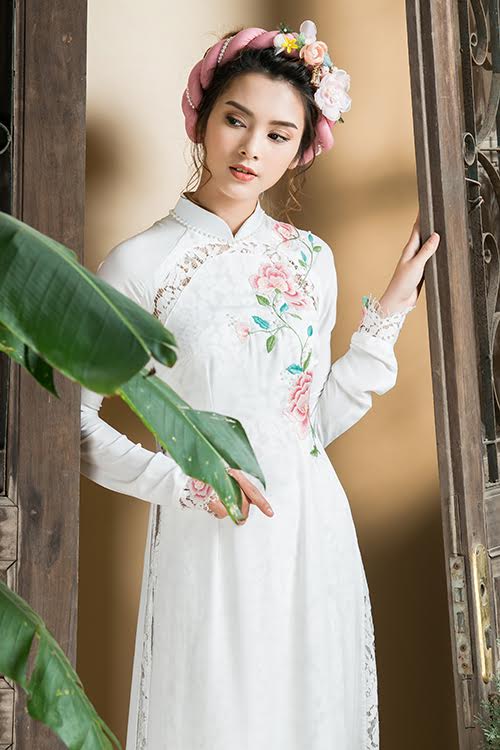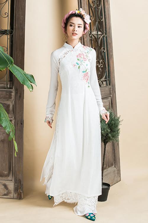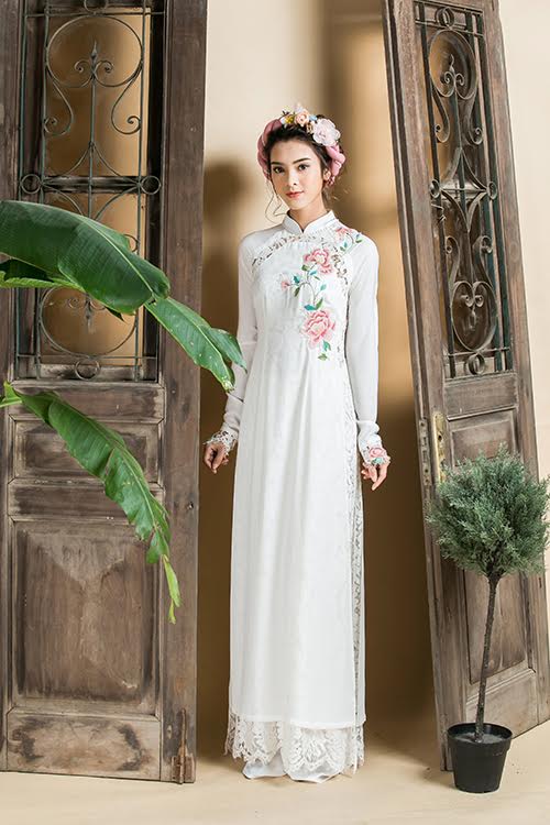 Những mẫu áo dài lụa thêu hoa văn cho cô dâu