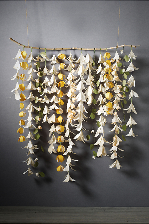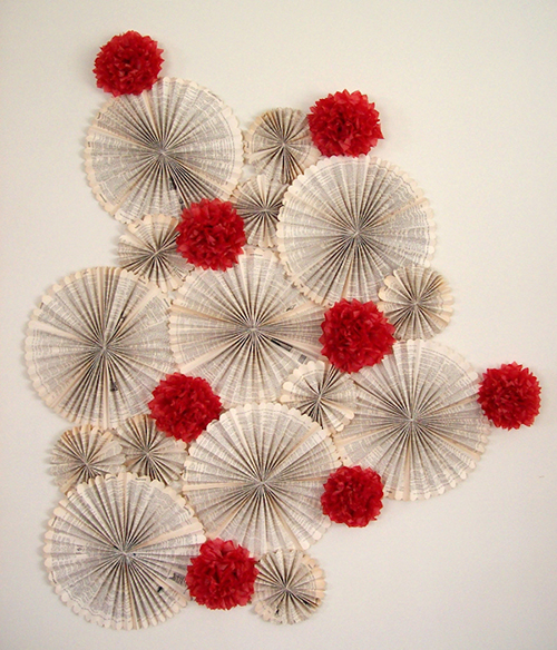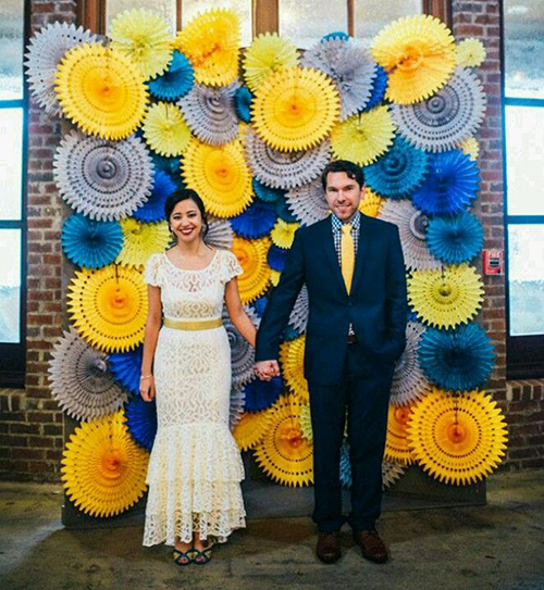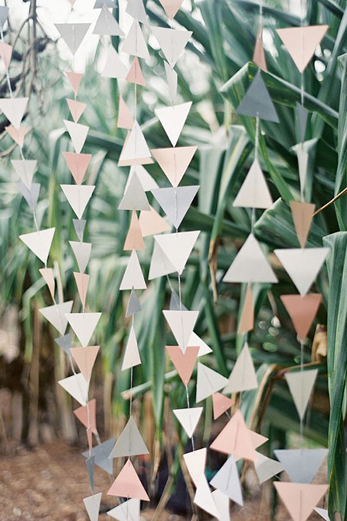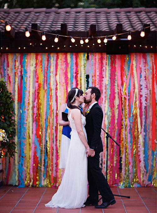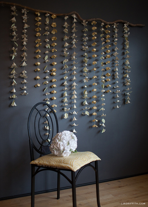 Những tấm backdrop kết từ hoa giấy hay các loại quạt tròn làm bằng giấy có ưu điểm về màu sắc rực rỡ, dễ làm và chi phí thấp. Tương tự như backdrop hoa giấy, backdrop kết từ hạc giấy hoặc hoa dây sẽ tạo ra một tấm rèm độc đáo.