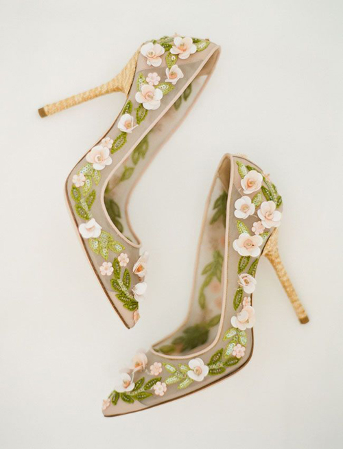 Trong các phụ kiện dành cho cô dâu ngày cưới, đôi giày quan trọng không kém chiếc váy trắng bồng bềnh. Đôi giày tốt sẽ giúp cô dâu di chuyển thoải mái, tự tin cả ngày dài. Trong mùa cưới 2017, giày cưới đính hoa nổi 3D trên nền sắc màu pastel nhã nhặn được nhiều cô dâu yêu thích. Hơn nữa, những thiết kế này dễ dàng kết hợp với váy cưới trắng và hoa trang trí trong buổi tiệc. Sau hôn lễ, cô dâu có thể tái sử dụng đôi giày trong các sự kiện khác.