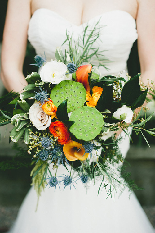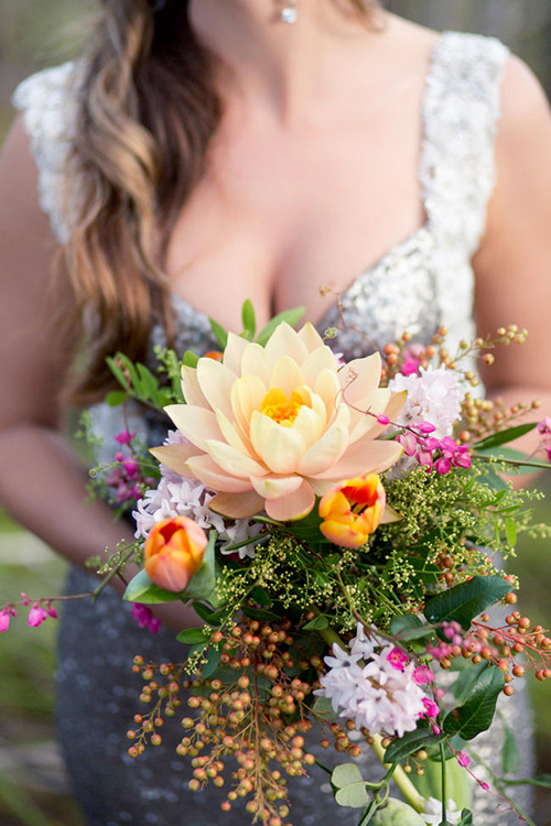 Nếu bạn muốn thay đổi phong cách với hoa sen, hãy thử phối một bó hoa cầm tay độc đáo với bông sen làm điểm nhấn.