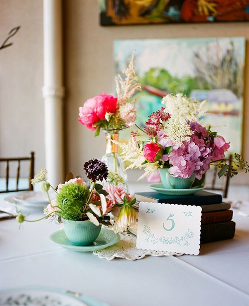 Cô dâu, chú rể có thể tận dụng những chiếc ly, tách cũ để làm điệu cho bàn tiệc trong tiệc tối, đó có thể là những tách trà đậm nét quý tộc châu Âu hoặc kiểu cốc đơn giản, sang trọng. Với phong cách này, bạn nên cắm hoa dáng tròn, cuống ngăn như cẩm tú cầu, mẫu đơn, hoa hồng…