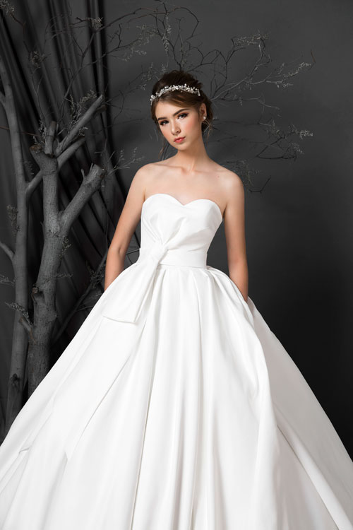 Bên cạnh đó, cô dâu có thể chọn chiếc váy satin có điểm nhấn bằng chiếc nơ thắt nhẹ ở phần trước ngực, kéo dài xuống eo cùng với thiết kế cúp ngực. Mẫu váy này giúp cho cô dâu giữ được nét dịu dàng mà vẫn quyến rũ.