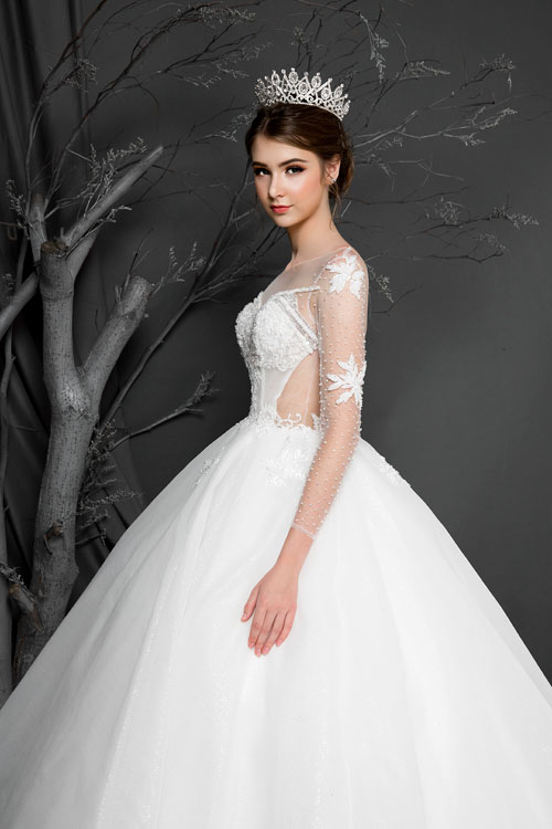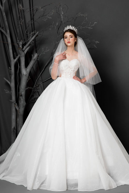 Kín đáo nhưng vẫn toát lên nét đẹp quyến rũ là ưu điểm của chiếc váy dài tay đính cườm hoặc kết kim sa. Phần chân váy xòe bồng được may bằng những chất liệu cao cấp để tôn dáng váy và sự sang trọng, thân váy tạo phom nhiều lớp (layers). Trang phục & Ảnh: Sunny Bridal Việt Nam.