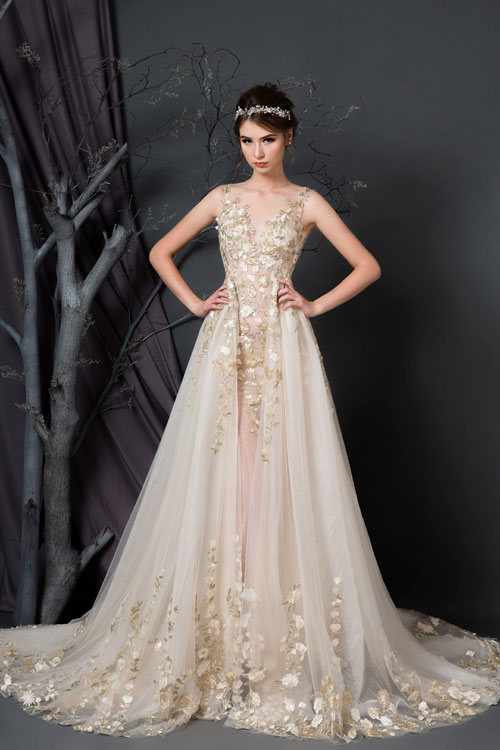 Bên cạnh một màu trắng cổ điển, cô dâu có thể lựa chọn mẫu váy xòe công chúa tối giản màu nude đính những bông hoa nhí. Chiếc váy mang phong cách lãng mạn, bay bổng.