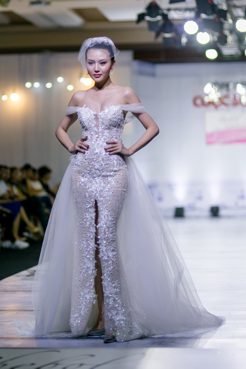 Ngoài việc sử dụng những mẫu ren với hoạ tiết bắt mắt, vải sequins, lụa, vải lưới phủ kim tuyến cũng được lựa chọn để tăng thêm sức hấp dẫn cho bộ sưu tập.