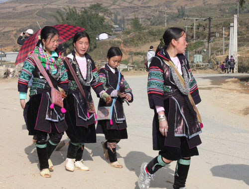 Những cô gái Mông xúng xính váy áo xuống chợ. Ảnh: Anh Phương.