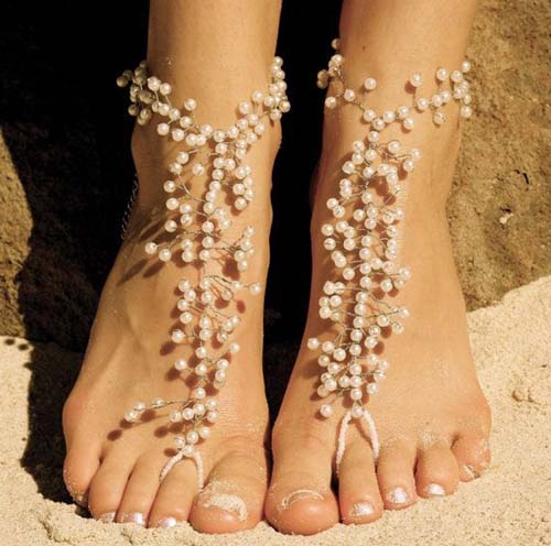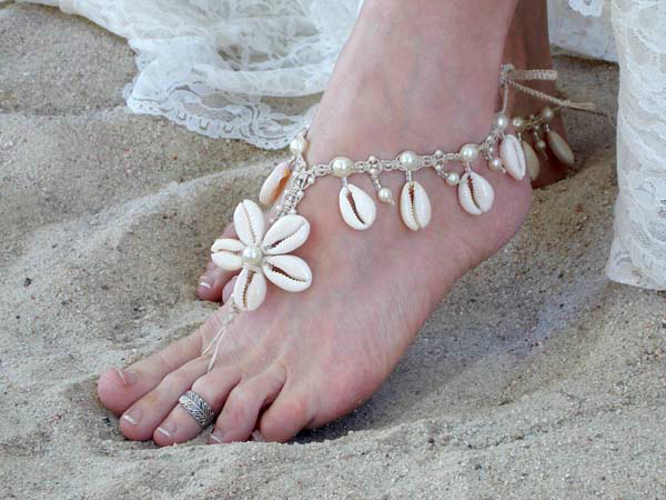 Vỏ sò, vỏ ốc và ngọc trai tạo nên đôi barefoot sandals ton sur ton với chủ đề biển cả.