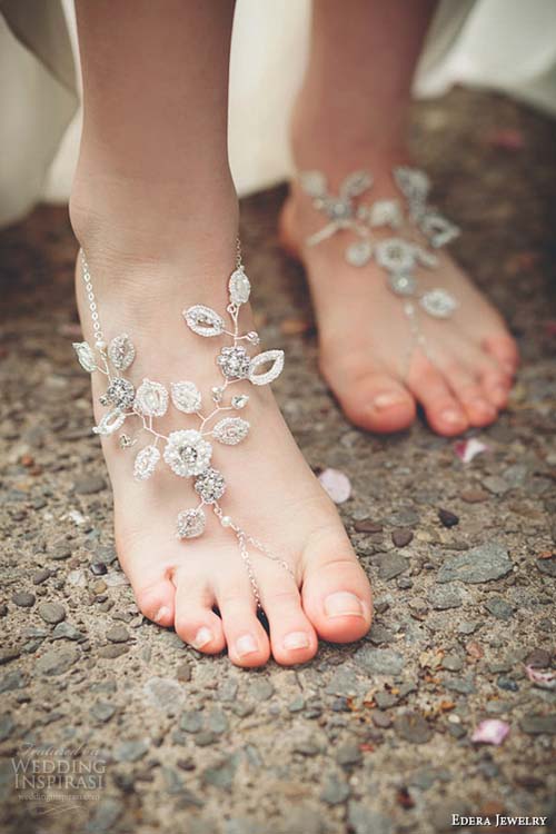 Barefoot sandals được biến tấu giúp đôi chân cô dâu thêm ấn tượng bằng các họa tiết từ đá, ngọc trai hay ren.