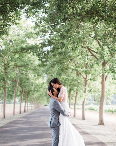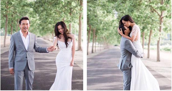 Trong ngày tái hôn, siêu mẫu diện soiree ren lộng lẫy, tôn lên vẻ đẹp trẻ trung và thân hình thon thả. Ông xã cô bảnh bảo với vest. Cặp đôi tình tứ chụp ảnh giữa bối cảnh đồng quê yên bình.
