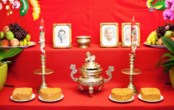 Bàn thờ lễ gia tiên miền Bắc thường được phủ vải đỏ để tăng thêm phần trang trọng