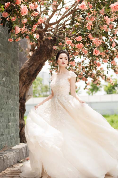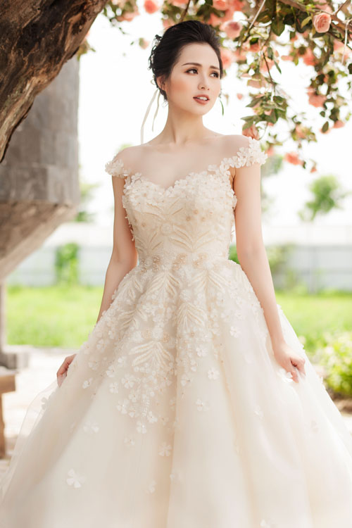 Trong bộ ảnh mới, "gái một con" Tâm Tít trở thành cô dâu, khoe vẻ đẹp dịu dàng và lộng lẫy cùng các mẫu soiree đính ren, đá cầu kỳ. Mẫu thiết kế có phần tùng váy xòe rộng cùng điểm nhấn xẻ ngực sâu là gợi ý hoàn hảo cho cô dâu trong mùa cưới 2017.