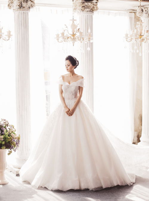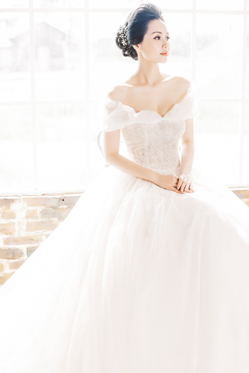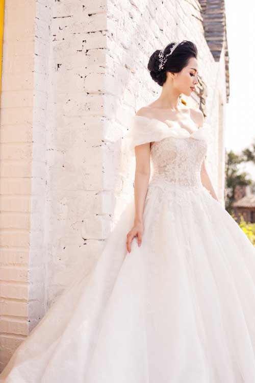 Tâm Tít như hóa nàng công chúa Lọ Lem trong bộ váy cưới trễ vai bồng bềnh.