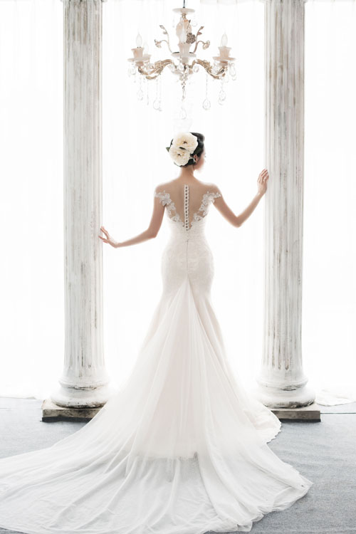 Trong ngày trọng đại, cô dâu có thể mặc chiếc váy đuôi cá với phần tùng váy đính thêm phía sau, tạo vẻ thướt tha, bay bổng. Phần tùng váy này có thể được tháo ra khi cô đâu đi chúc khách ở các bàn tiệc.