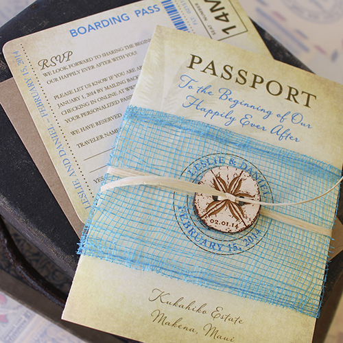 Những tấm thiệp cưới passport nhỏ xinh mô phỏng cuốn hộ chiếu tượng trưng cho tấm vé mời dành cho quan khách cùng đến hành trình của hạnh phúc.