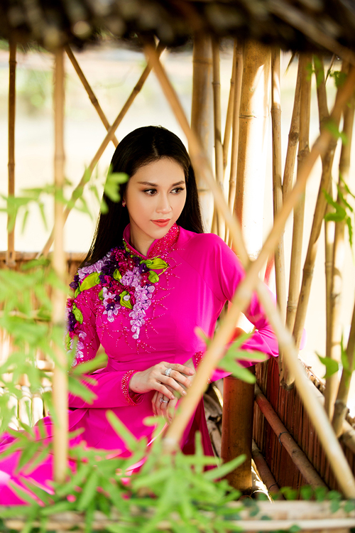 Thu Vũ khoe dáng với áo dài lụa đính hoa ruy băng