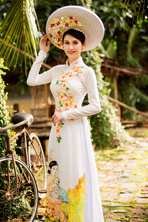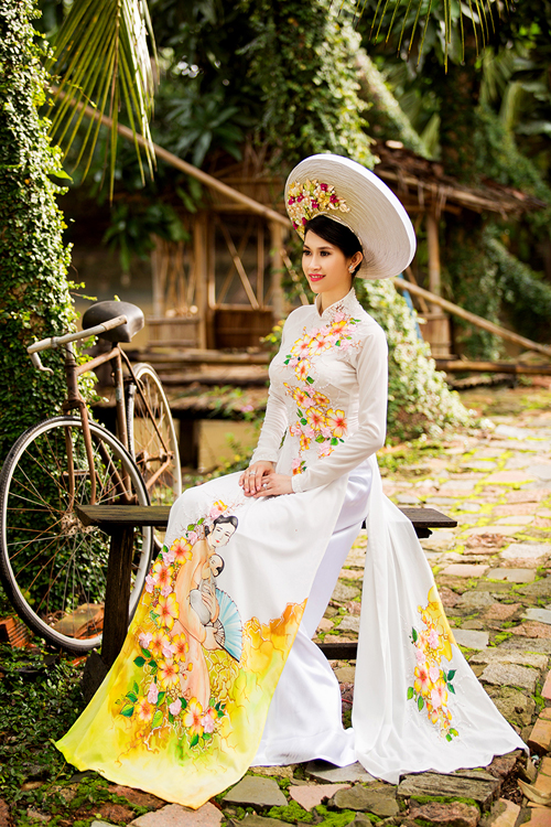 Thay vì những mẫu áo dài ren cầu kỳ, cô dâu có thể gây ấn tượng với quan khách trong ngày trọng đại bằng áo dài lụa trắng cùng họa tiết hoa tươi sáng.