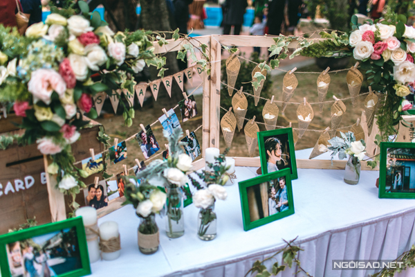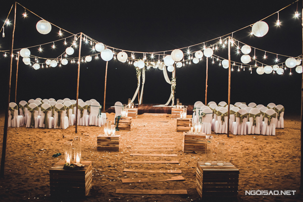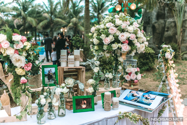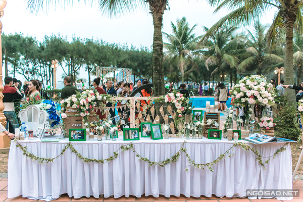 Là người yêu thiên nhiên, Ngọc Ánh mong muốn một đám cưới theo phong cách rustic lung linh, xanh mượt. Phần lễ cưới chính được tổ chức ngoài trời sát biển, tiếp theo đó là tiệc mời bên bể bơi trong khuôn viên một resort tại Bãi Lữ.