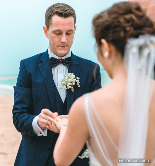 Giây phút thiêng liêng khi chú rể Mathew trao nhẫn cưới cho cô dâu Ngọc Ánh trước sự chứng kiến của gia đình và hơn 400 khách mời.