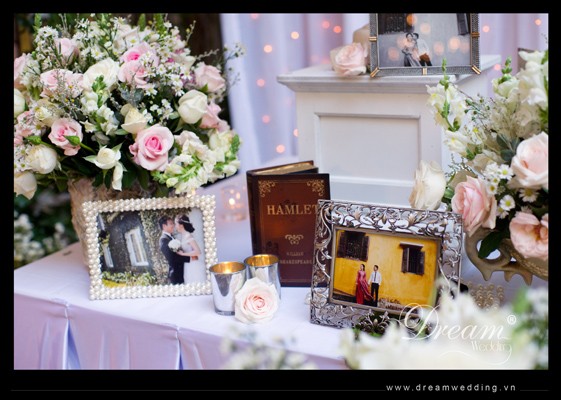 Trang trí tiệc cưới ngoài trời, sân vườn - khung hình, hoa, nến và các phụ kiện được trang trí trên bàn ký tên