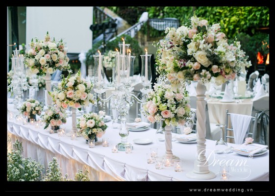 Trang trí tiệc cưới ngoài trời, sân vườn - hoa tươi đặt trên các chân gỗ đặt xen kẽ với chân nến pha lên trên bàn VIP