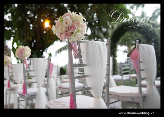 Trang trí tiệc cưới ngoài trời, trang trí tiệc cưới tại Thảo Điền Village - hoa tươi trang trí trên ghế tiffany bạc