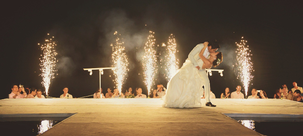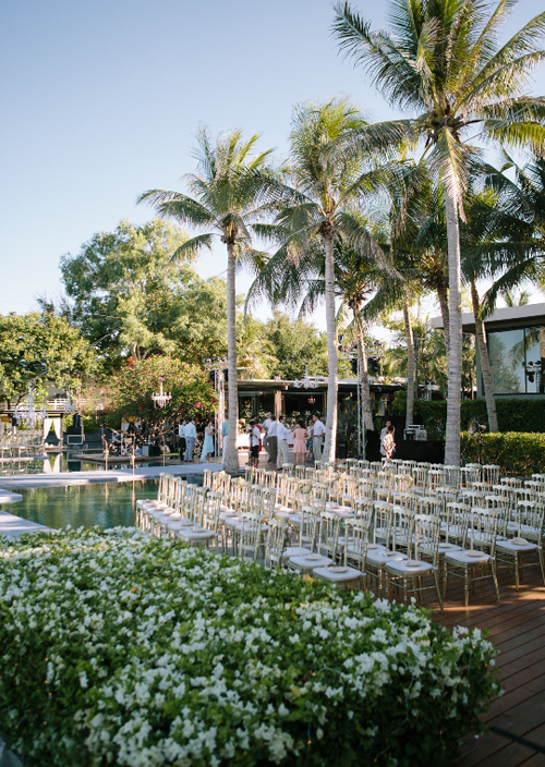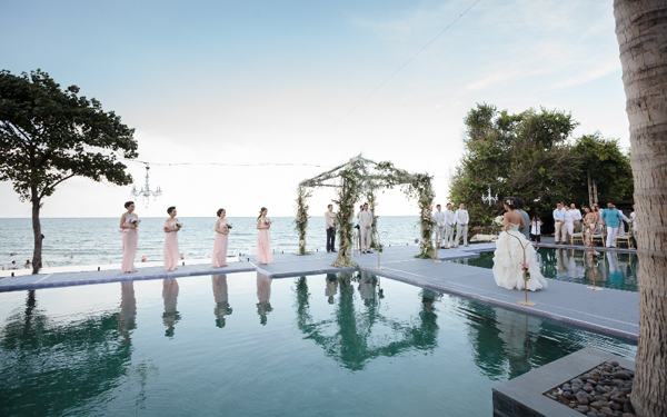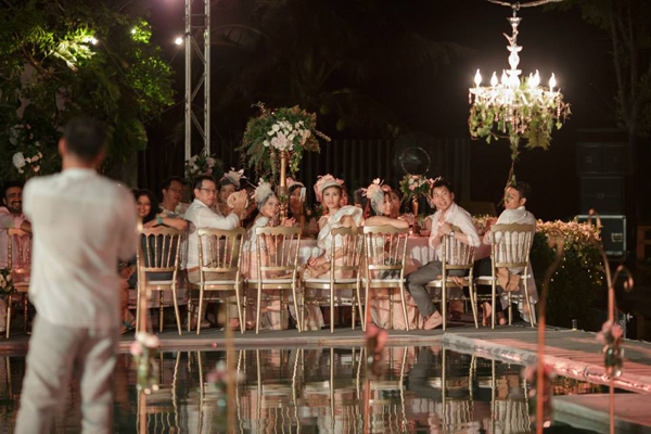 Phần lễ cưới chính được tổ chức ngoài trời, tiếp theo đó là dạ tiệc bên bể bơi trong khuôn viên resort.
