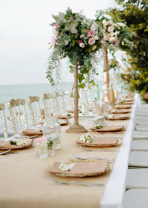 Tiệc tối được tổ chức bên bể bơi sát biển. Những dãy bàn tiệc dài trang trí theo phong cách rustic nhẹ nhàng, trẻ trung.