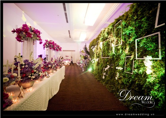 Hình ảnh khu vườn với bức tường lá màu xanh cũng được trang trí trong tiệc. Với các khung hình trống đính 1 vài cành hoa lan hồ điệp được treo lên 1 cách nghệ thuật.