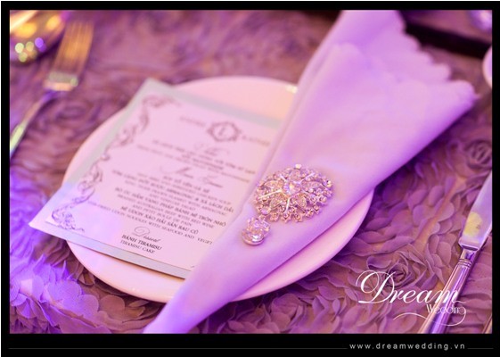 Chú trọng đến những chi tiết nên khăn ăn và thực đơn cũng được trang trí và thiết kế riêng