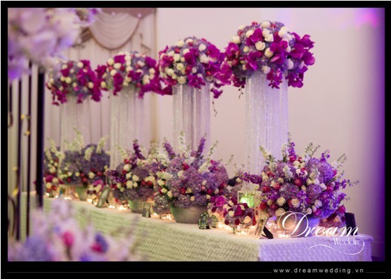 Điểm nhấn chung của buổi tiệc được thiết kế là lối đi với các đôn hoa tươi pha lê, nến, và các phụ kiện đi kèm tạo nên 1 không gian lộng lẫy nhất của buổi tiệc
