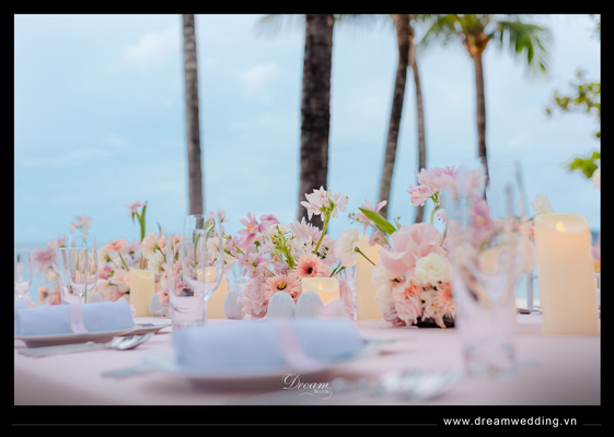 Dựa trên những lời chia sẻ của Jack & Jane về ước muốn được ngồi cùng bạn bè và gia đình trên bãi cát trắng cạnh bãi biển, Dream Wedding đã chăm chút tỉ mỉ từ những chi tiết nhỏ nhất để tạo nên một chiếc tiệc tối ấm cúng bên bờ biển đầy ngọt ngào với bàn tiệc dài vừa nhẹ nhàng, vừa tinh tế dưới những tán lá dừa xanh mướt.