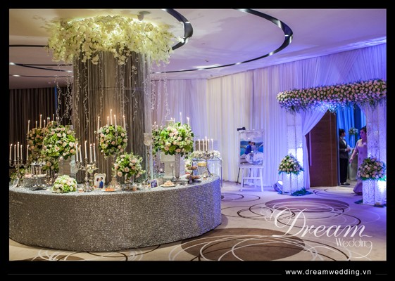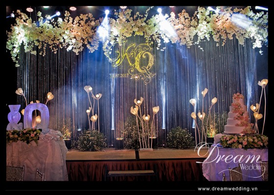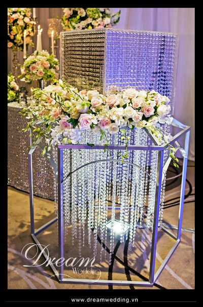 Trang trí tiệc cưới, trang trí đám cưới tại Nikko Hotel - sân khấu trang trí hoa tươi, pha lê và trang trí bánh kem, tháp rượu