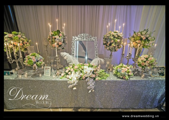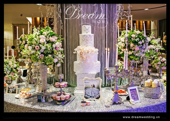 Trang trí tiệc cưới, trang trí đám cưới tại Nikko Hotel - bánh kem, nến, khung hình, hoa tươi trang trí trên bàn gallery