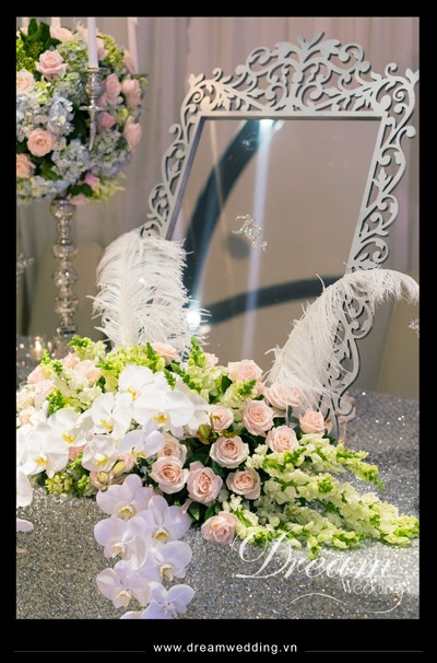 Trang trí tiệc cưới, trang trí đám cưới tại Nikko Hotel - hoa tươi trang trí dưới chân tranh ký tên khung bạc