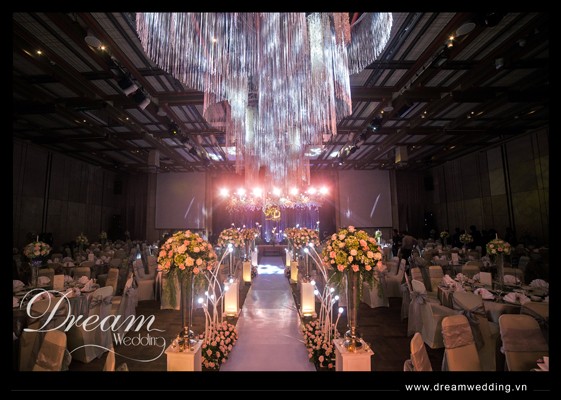 Trang trí tiệc cưới, trang trí đám cưới tại Nikko Hotel - hoa tươi, nên điện trang trí dọc lối đi lên sân khấu