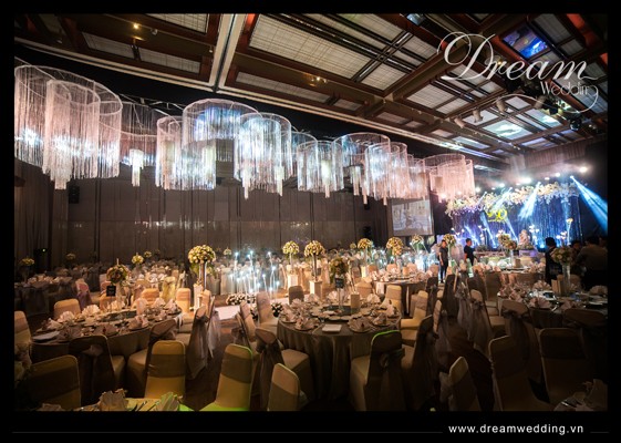 Trang trí tiệc cưới, trang trí đám cưới tại Nikko Hotel - lối lên sân khấu được treo các vòng tròn pha lê làm tăng thêm độ lung linh
