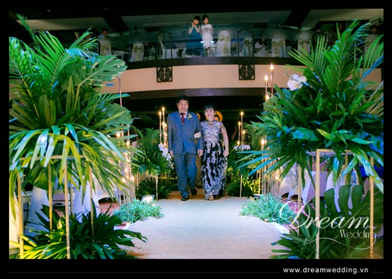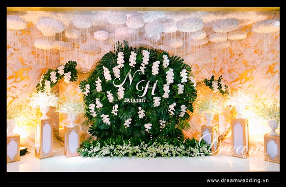 Đám cưới của CR Tùng Nguyên & CD Vân Hà được Dream Wedding thiết kế và trang trí theo chủ đề tropical với 2 tông màu chủ đạo là xanh của lá và trắng của hoa kết hợp cùng các phụ kiện vàng đồng