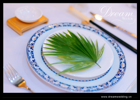 Trang trí tiệc cưới theo chủ đề tropical, trang trí tiệc cưới tại Metropole - lá xanh trang trí trên dĩa khăn ăn
