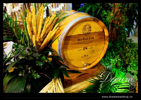 Trang trí tiệc cưới theo chủ đề tropical, trang trí tiệc cưới tại Metropole - thùng tiền là thùng gỗ rượu vang