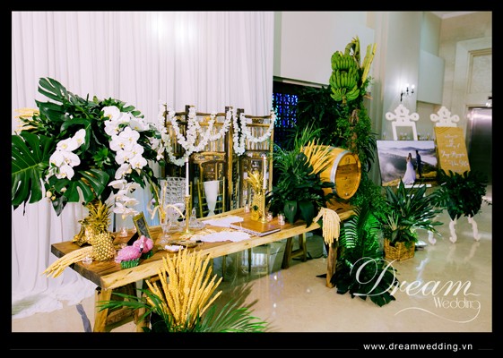 Trang trí tiệc cưới theo chủ đề tropical, trang trí tiệc cưới tại Metropole - phụ kiện, hoa lá trang trí trên bàn ký tên