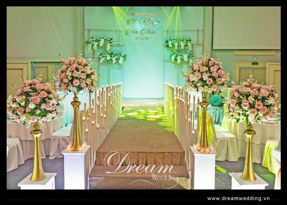 Trang trí tiệc cưới, trang trí đám cưới - các đôn hoa và nến trang trí lối lên sân khấu