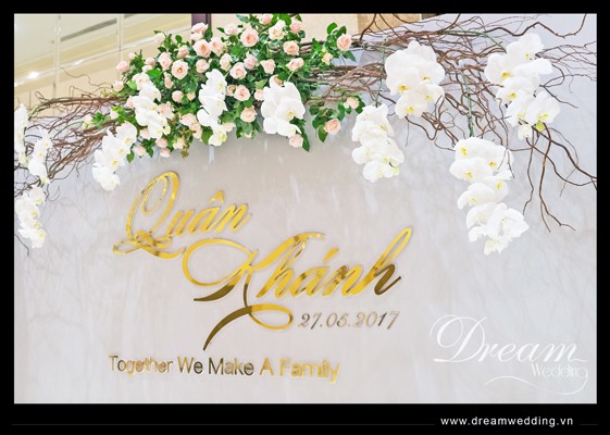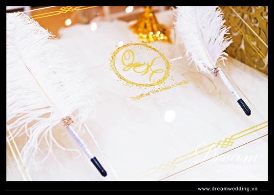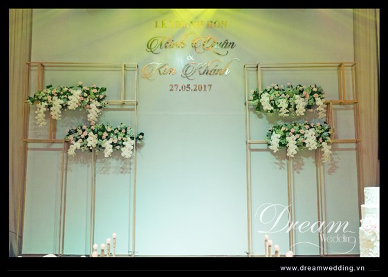 Tiệc cưới Quân & Khánh tổ chức tại trung tâm hội nghị tiệc cưới White Palce được Dream Wedding thiết kế trang trí đơn giản theo tông màu trắng, hồng pastel kết hợp với màu vàng đồng của các phụ kiện.