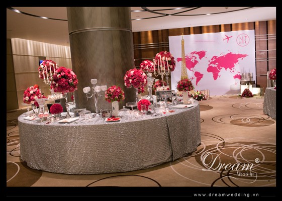 Tông màu đỏ kết hợp với hồng đậm được Dream Wedding kết hợp trong trang trí tiệc cưới của Nam Phương & Romain tổ chức tại sảnh tiệc cưới sang trọng khách sạn 5 sao Nikko. Sau đây là những hình ảnh đẹp trong trang trí tiệc cưới của anh chị từ khu vực đón khách, phông chụp hình, bàn ký tên, gallery cho đến lối đi, sân khấu: