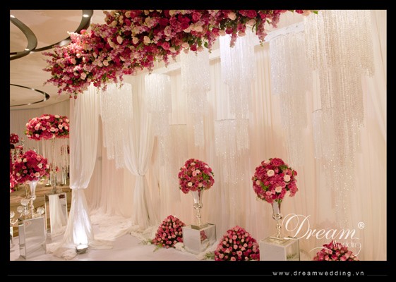 Trang trí tiệc cưới tại Nikko Hotel, trang trí đám cưới - phông chụp hình rộng với hoa tươi phía trên và các đôn hoa tươi 2 bên